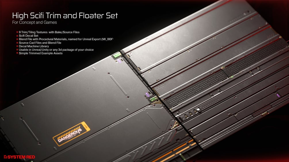 This Trimsheet and Floater Pack contains everything you need to quickly create high-quality sci-fi concept art & production work for environments, vehicles and props.